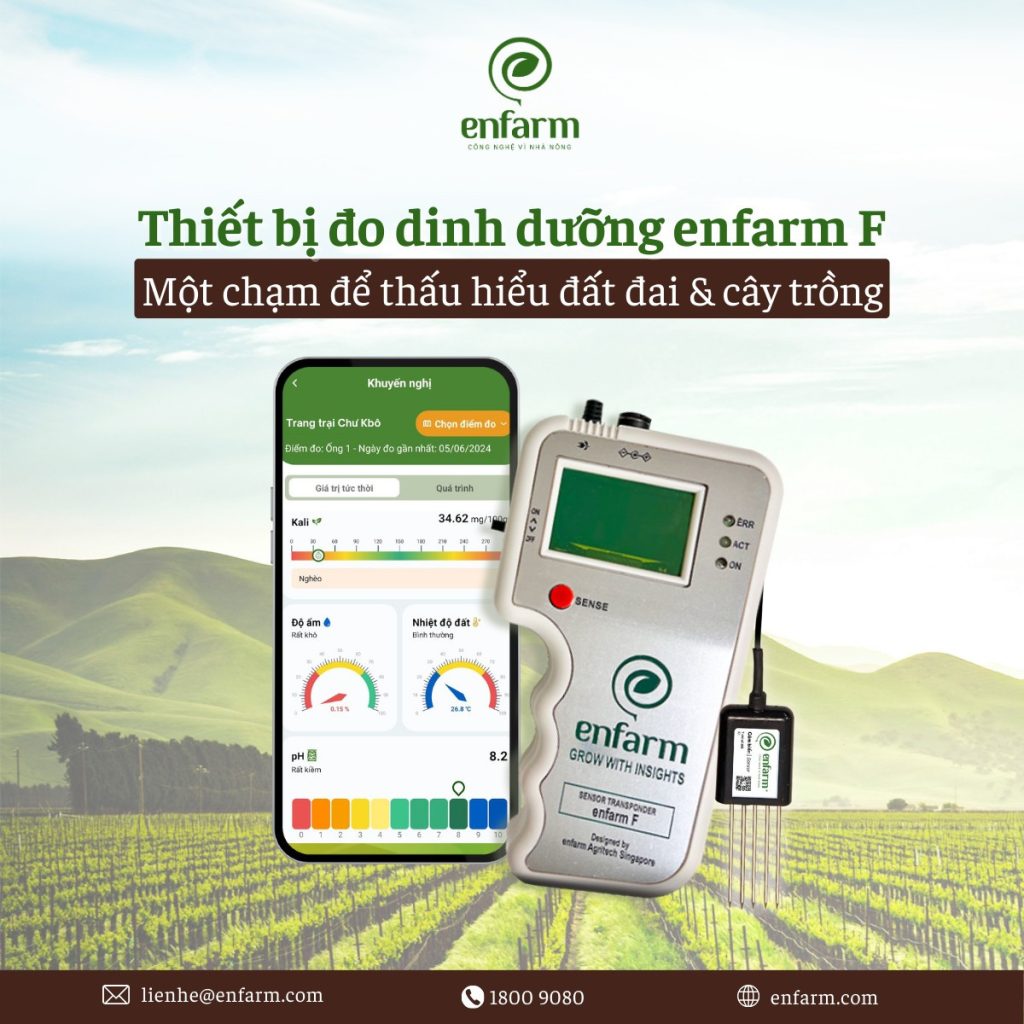 Bộ thiết bị đo dinh dưỡng enfarm F một chạm mới với thiết kế đơn giản, dễ dùng là sản phẩm giúp nông dân đo lường và kiểm soát các chỉ số quan trọng như hàm lượng phân bón NPK, độ pH, nhiệt độ và độ ẩm trong đất nhanh chóng và chính xác. Bên cạnh đó, hệ thống AI của enfarm còn cung cấp khuyến cáo bón phân và tưới nước dựa trên dữ liệu thu thập được, giúp bà con đưa ra phương án canh tác kịp thời để tăng năng suất cây trồng và giảm chi phí nguyên liệu.